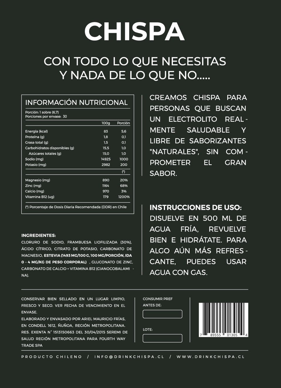 Incluso si nos devuelve un contenedor vacío, le reembolsaremos su compra. Creemos en nuestros productos al 100%, por lo que si por alguna razón decide que no son para usted dentro de los 90 días posteriores a la compra, avísanos por correo electrónico: info@drinkchispa.cl